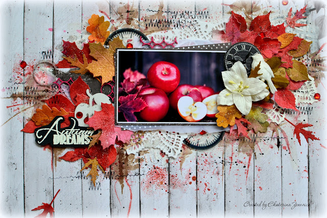 Итак, к работе). Фоновый лист от Scrapberry's, далее немного грунта и конечно спреев Lindy's. Добавила штампов Lesia Zgharda. Основной декор у меня листья - это вырубка из акварельной бумаги, предварительно покрытой спреями Lindу's - обожаю этот ножик). Сверху на листиках "первый лед" в виде деко-топпинга от "Фабрики Декору". Чипборд тоже тонирован спреями. Еще неизменная моя любовь салфеточка от Prima, часики от Scrapberry's, оверлей, пластиковая птичка, кабошон и стразики. Вот и все!)